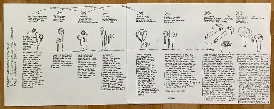 Hand drawn timeline exploring how changes to a products design has impacted the user experience.